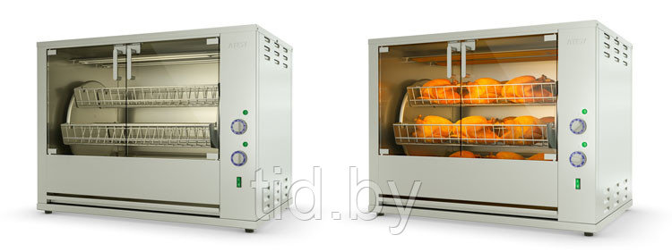 Время приготовления при полной загрузке камеры 60-70 минут. Терморегулятор гриля обеспечивает регулировку температуры в диапазоне от +50°C до +250°C. Благодаря вращению четырех садков с продуктом, происходит равномерная тепловая обработка его со всех сторон.